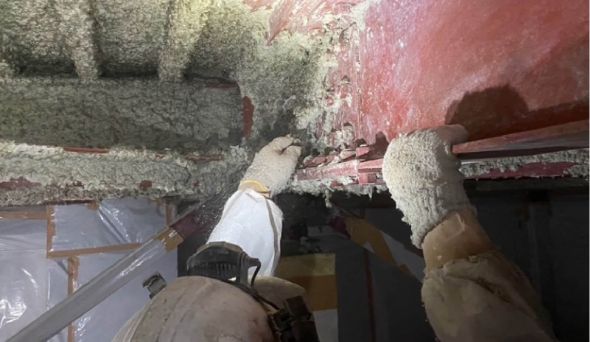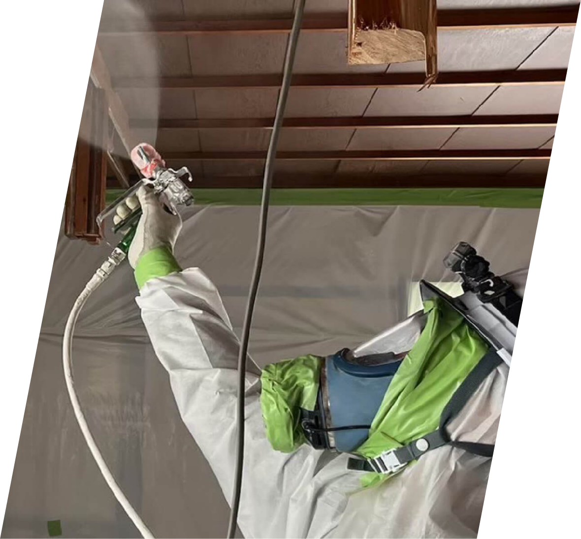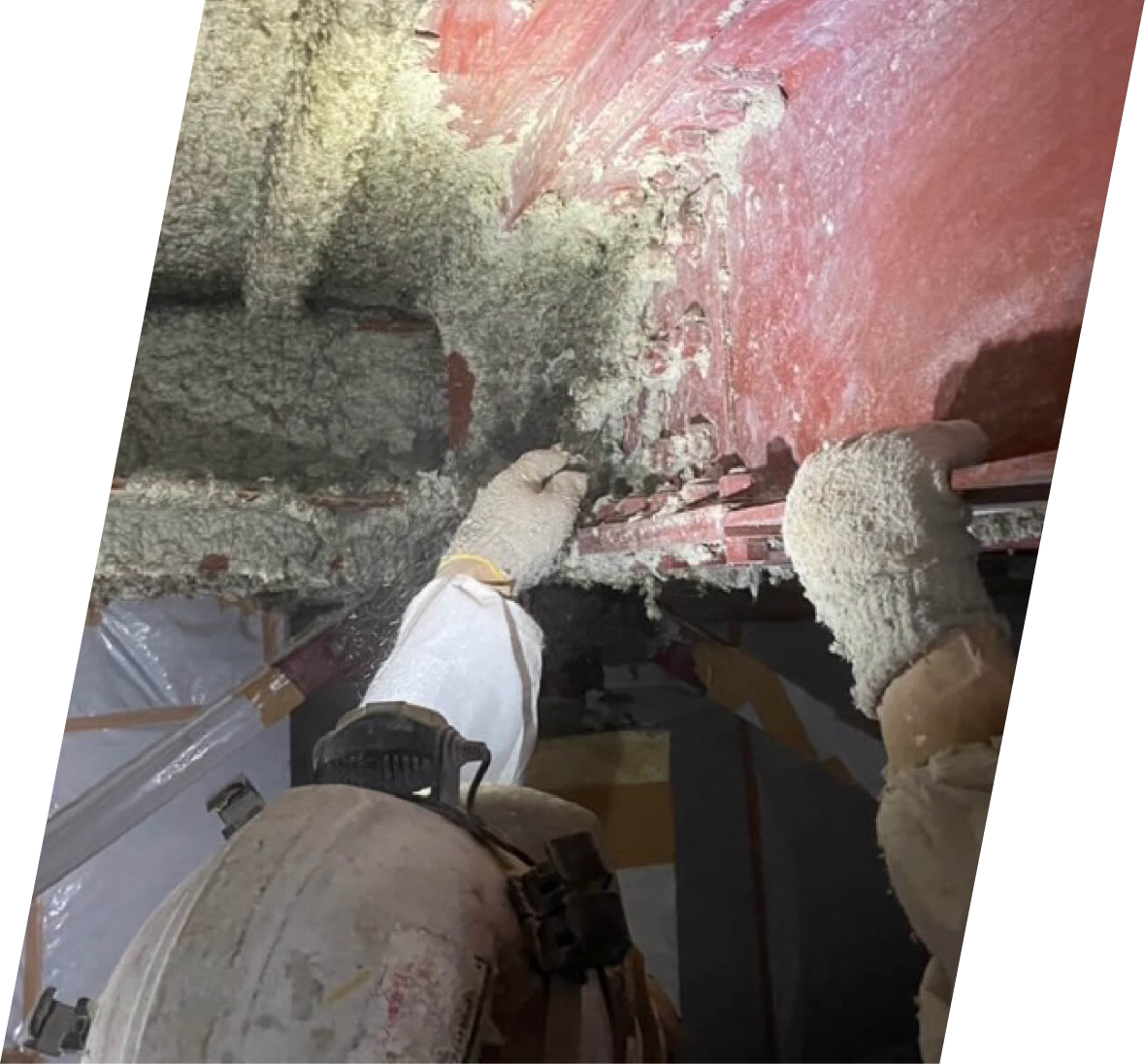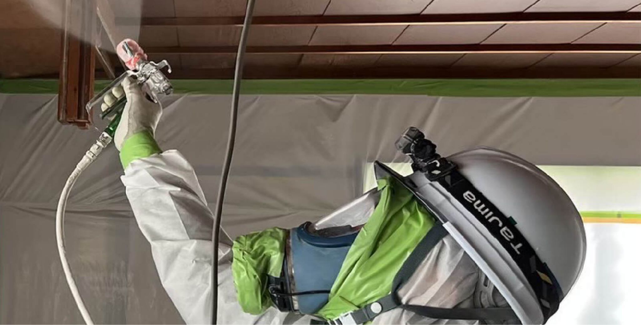 作業は厳重な管理下で行われ、飛散を防ぐために防護服や呼吸用マスクを着用し、隔離環境でアスベストの除去を行います。外壁除去や吹付材の取除き、壁や天井ボード撤去、配管エルボの取り外し、ダクトパッキン除去など、発塵性が著しく高いアスベスト除去工事にも対応しています。